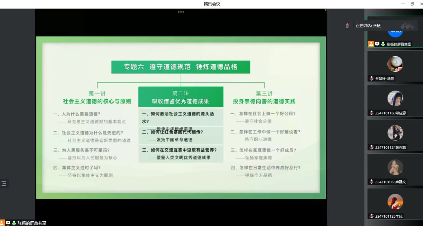 为深入推进二十大精神进思政课堂、进教案、进员工头脑,bevictor伟德官网思想道德与法治教研室朱坤老师于11月18日上午第一节以腾讯会议的形式举行了一场范式公开课,11月19日上午第三节,张杨老师以腾讯会议的形式举行了一场青年教师展示课。