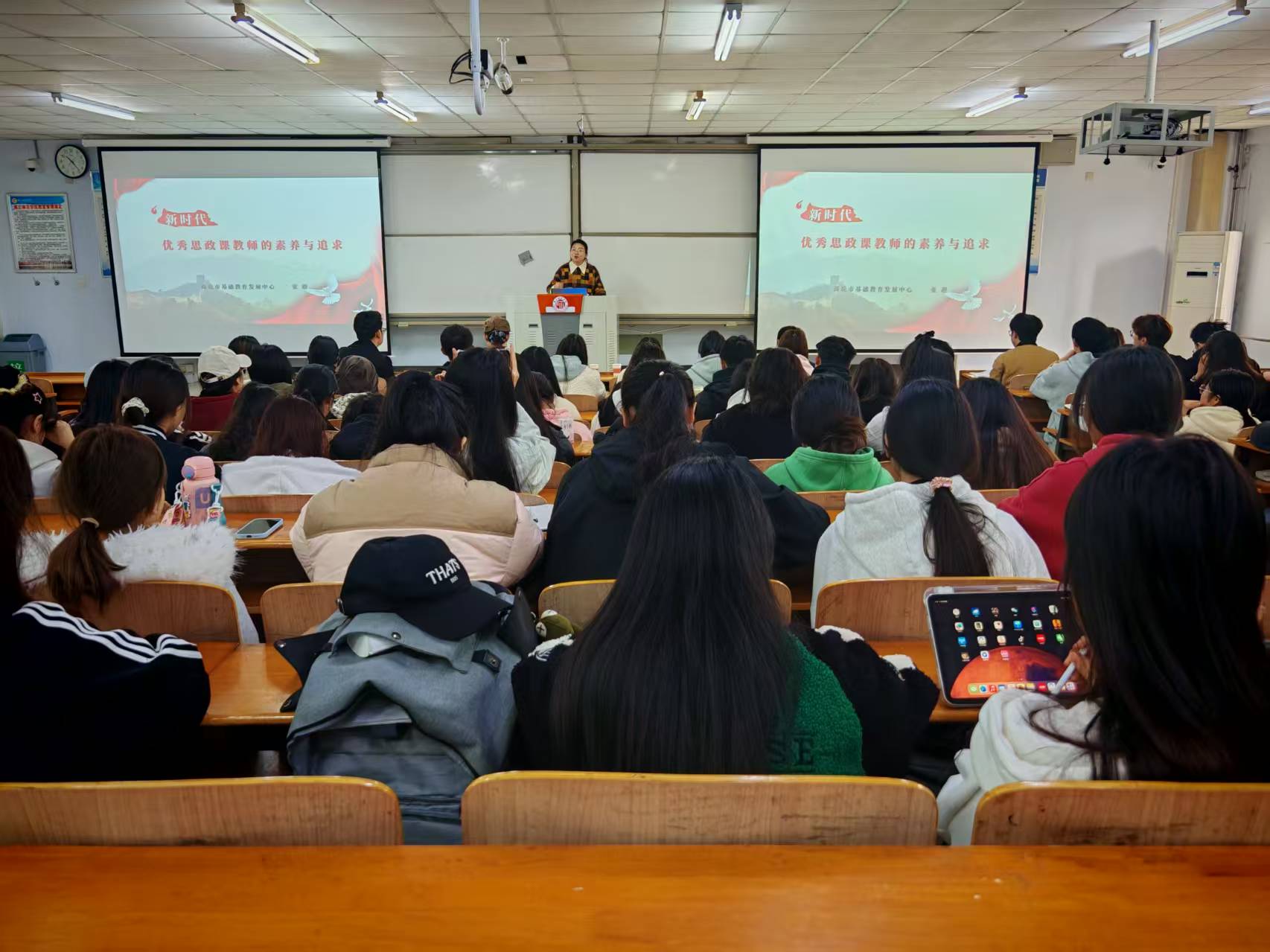 最后,张超老师作题为《新时代优秀思政课教师的素养和追求》讲座。张老师强调,思政专业师范生作为未来铸魂育人的关键力量,既要具备扎实的理论功底,更要以高尚的师德师风为员工树立榜样,将价值引领融入教学科研全过程。讲座中,张老师还分享了自己关爱员工的鲜活案例,引发在场师生的强烈共鸣。